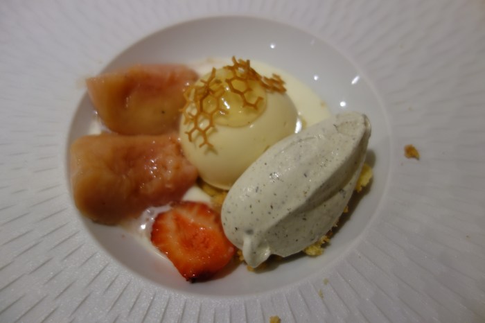 Dinner ended with a fruity and floral touch. Dessert #2 was two cool slices of poached pear served in a bowl with a quenelle of floral and fresh verbena ice cream and a dense and smooth ball of custard with a very deep honey flavor. This was topped with a bright and acidic lemon gelée, which offset the flowery sweetness of the custard nicely. Underneath it all was a buttery, flaky sablé shortbread cookie, which added texture and a touch of salt to even out the sweetness. And a slice of dehydrated strawberry brought an extra hint of acidity. Another beautifully composed dish, whose combination of verbena, honey, peach and citrus flavors whispered “It’s summer,” and sent us into a pleasant post-meal haze.