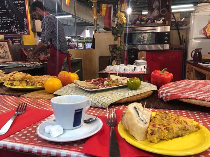 The truth is that the Spaniard makes the most dreamy, mouthwateringly delicious tortillas, which never fail to hit the spot hungover, still drunk or stone-cold sober. He usually makes two or three different kinds, my favorite being the one loaded with spicy pieces of chorizo. In terms of texture, these tortillas are perfection. They’re thick and dense but not too dense, seductively moist and super fluffy, despite being loaded with tender bits of potato. They come served with a slice of baguette with a single pickled anchovy, whose tart, briny flavor add the perfect kick to the cozy flavors of the tortilla. The Spaniard also serves platters of cured jamón serrano, correctly sliced into paper-thin pieces. And to drink, a glass of Spanish red feels much more appropriate than a latté, and will be served with much more enthusiasm, judging by our experience.