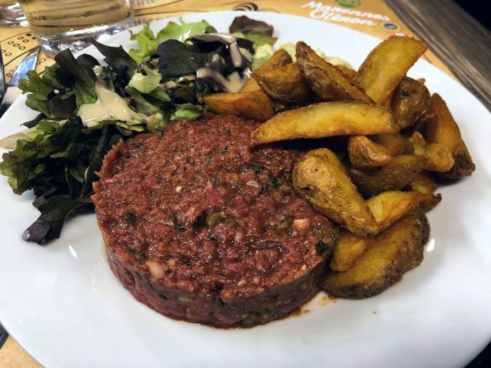 With an ice pack keeping our perishables nice and cool, we ordered seconds. Ben got a juicy bavette, a quality piece of meat topped with caramelized shallots, with a side of perfect fries (or fried baby potato wedges, to be specific) and a creamy tarragon-flavored mayonnaise to dip into. I ordered a beef tartare which came with gorgeous, crumbly-creamy raw beef bound, according to tradition, by a raw egg yolk, and accented here and there with chopped shallot and capers. In the case of both the bavette and tartare, the meat had come from a vendor just a few feet over. It was fresh, tender, flavorful meat selected by the restaurant – no doubt – early in the morning, before the people of Bordeaux had even crawled out of bed. So, in a way, it was perhaps some of the freshest meat in Bordeaux at this time, and sold for around half the price as it would be in a restaurant in the center. Needless to say, it’s a good deal. It left us pretty damn pleased for sure.