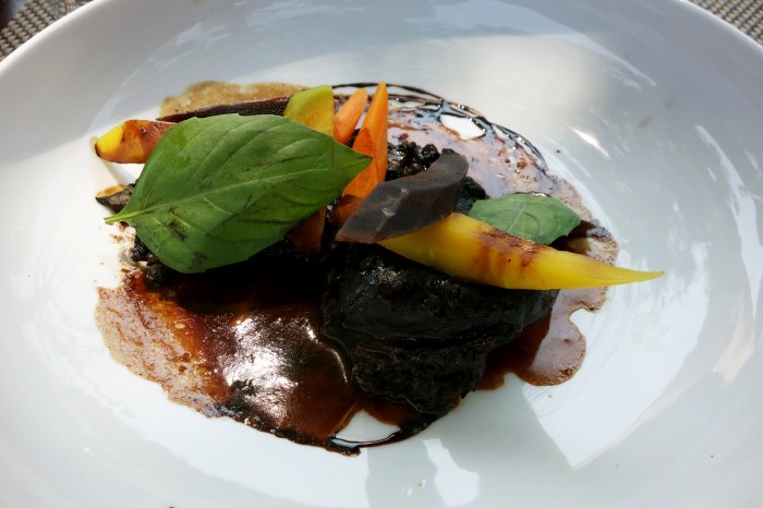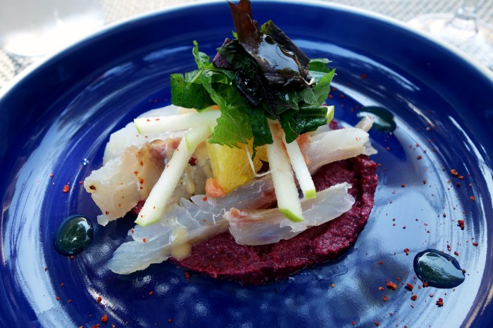 For the entree course, I chose a fish dish that featured juicy, slick slivers of some kind of local white fish, cured and then smoked for good measure. This preparation gave the chilled bits of fish a hearty, almost elastic texture and the feintest lick of a smoky flavor, which was beautifully complemented by a bright violet purée of earthy beetroot at its base. The fish was also topped with bright pieces of orange and green apple for a splash of acidity, and some bitter green herbs over the top, which tasted of licorice. Spattered around the dish was also some kind of tart lemon sauce, a tad too aggressive for my taste. All in all, a very refreshing start to the meal, pairing beautifully with the Les Clos de Paulilles Colliure Blanc. This blend of Grenache Blanc and Grenache Gris from Colliure’s sea-side slopes of schist is beautifully fresh and mineral, slightly floral on the palate. A great wine for just this kind of moment.