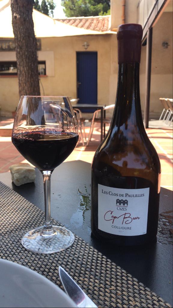 Having skipped continental breakfast and spent the morning roasting under the sun, I was hungry for something heartier than fish, so I chose their Joue de Porc as my main. Pork cheek is one of those magical pieces of meat, transforming with time in the pot and some good old culinary TLC into an ambrosial substance, so tender, so smooth. This one was braised in Banyuls, the local sweet red wine, which added a sinfully sticky, sweet glaze to the bits of fall-apart-soft meat. The pork was served with spears of steamed carrot and turnip, which added a nice firm texture to contrast the melt-in-the-mouth meat. Paired with the banyuls-licked pork was the Clos de Paulilles Cap Béar Rouge 2017, a blend of 60% Grenache and 40% Syrah. This was a medium-bodied, meaty red with ripe black fruit flavors and that unmistakable touch of Mediterranean garrigue. Its undertones of dry herbs, cocoa bean and spice offered the perfect savory touch to complement the sweetness of the meat.