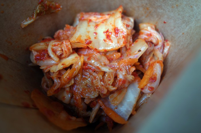 For a modest price of 2€, you can have a decent portion of kimchi on the side. This briny, funky, fermented pickle bursts out of its recyclable container guns blazing, offering tremendous flavor in each bite. A mélange of sour, pungent lactic acid with the red hot heat of the bright gochugaru (chili powder) and a kind of hearty umami in the background wakes up the palate, offering the perfect contrast to the cozy, savory flavors of the deopbap. The texture harmonizes perfectly too, with the chilled, slippery and addictively crunchy cabbage and bean sprouts complementing the tender, warm rice dish.