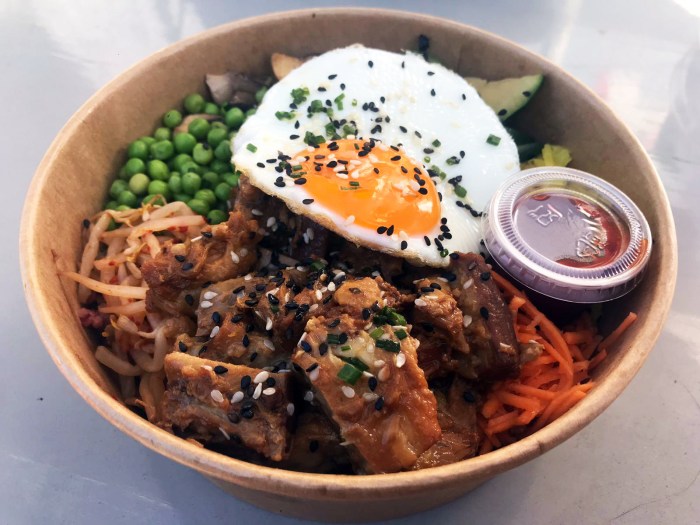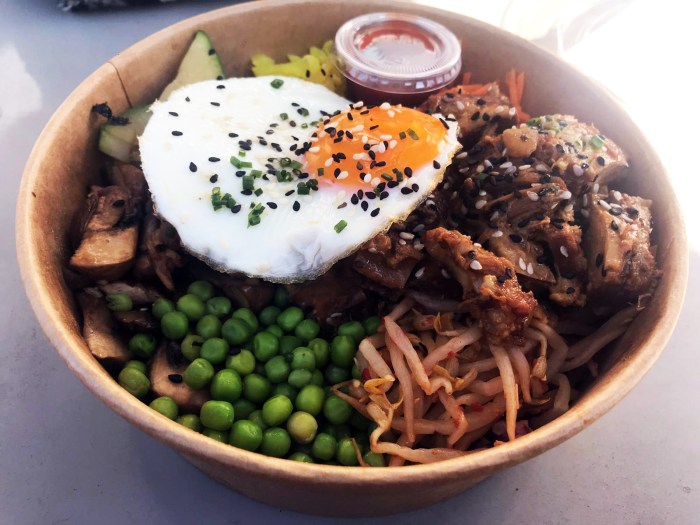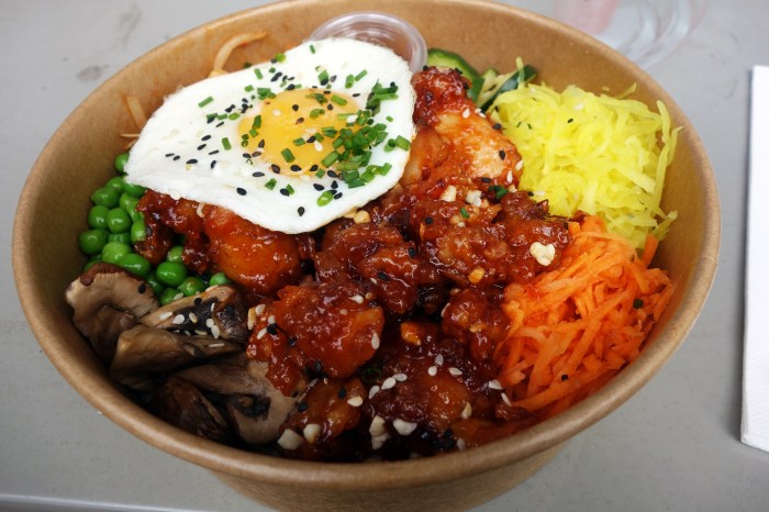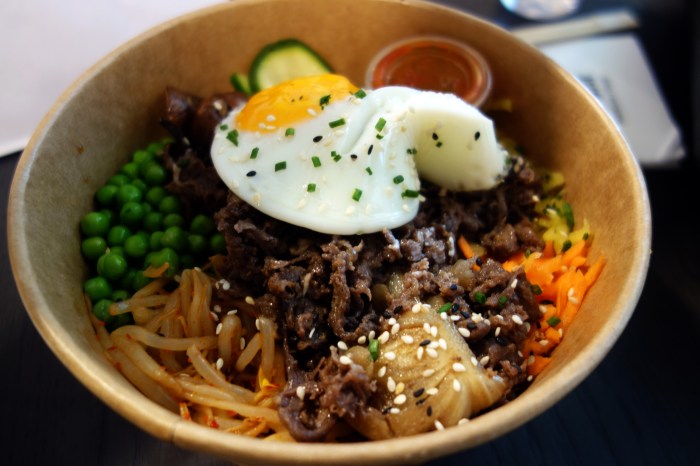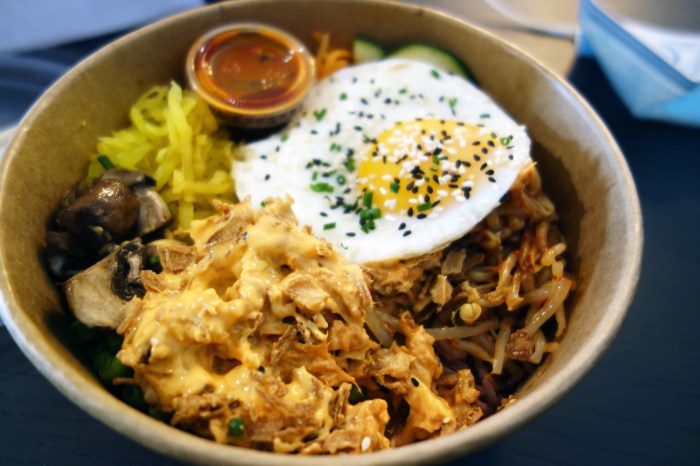 I’m not a huge fan of the Bulgogi Bibibap, which comes with thin slivers of sauteed beef in a bulgogi sauce. The latter blends soy sauce, brown sugar, garlic, ginger and sesame oil, creating a very balanced combination of salty, delicately sweet and almost nutty, savory flavors. This part is great. I take more of an issue with the texture of the meat, which leans towards dry in certain bites. When the same protein is stuffed inside a taco and slathered with Korean spicy mayonnaise, it forms a delicious meaty base. But presented as a bibi bowl, there just seems to be something missing. Maybe I just had it on an off-day, when the beef wasn’t cooked to its absolute juiciest, but, for the most part, I prefer the texture of both the chicken and pork bibibaps.