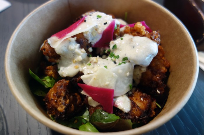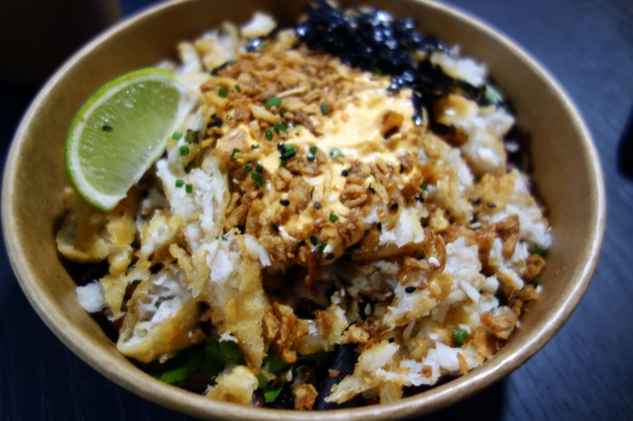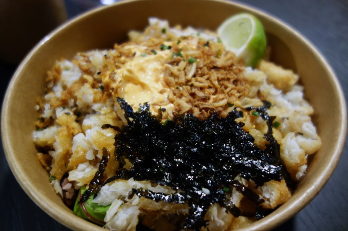 Deopbap is the even more copious alternative to bibibap, basically twice the amount of your protein of choice on a bed of purple rice and some layers of crunch and freshness here and there. I tried the Mulgogi Deopbap Spicy, which comes with a generous layer of breaded and fried cod filet sliced into bite-size pieces, topped with spicy Korean mayo, some paper-think sheets of nori and crispy fried onions for good measure. The fish is juicy and tender with a crunchy breaded coat, but isn’t too flavorful, making the spicy gochujang mayo, nutty nori and squirts of fresh lime over the top very necessary and much appreciated. Under the fish there is also a rather unexpected layer of kimchi and some greens wilted from the heat of the rice. The kimchi is key here, its acidity counteracting the fried stuff nicely. This dish also comes in a non-spicy version, with a yuzu-flavored tartar sauce.