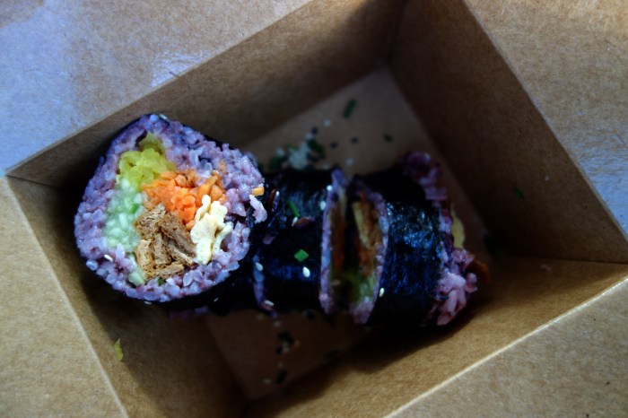 Available exclusively at Bibibap Boca is Gimbap, the Korean California roll made with the same purple rice that forms the base of their bibim- and deopbaps. The warm rice is rolled up with bits of firm tofu, tender scrambled egg, crunchy pickled radish, carrot and cucumber, all wrapped in a sheet of seaweed and served sliced up into two-bite pieces. Another creative way to reuse their main ingredients, this side is easy-to-eat and perfect to satisfy a “petit faim“.
