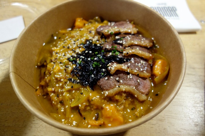 I got the Curry Duck Deopbap (we are in duck-country after all…). A bed of purple rice topped with a mélange of veggies (onion, mushroom, cubes of sweet potato), slathered in a bright orange Korean curry sauce. Thin slices of grilled duck breast come fanned out over the top, dusted with some crunchy seaweed, and white and black sesame seeds. While I appreciate the versatility of the Bibibap kitchen and their attempts to tackle yet another protein on their already very diverse menu, this duck was unfortunately very overcooked and tough to eat. I suspect it was prepared the same way as their bulgogi beef, resulting in a very beef-like texture, but on duck this means chewy, hard, dry and flavorless. The curry was there to add a punch of flavor back to the dish and was quite a cozy blanket over the usual rice base, but nothing I couldn’t make a better version of at home. This one was a no-go for me.