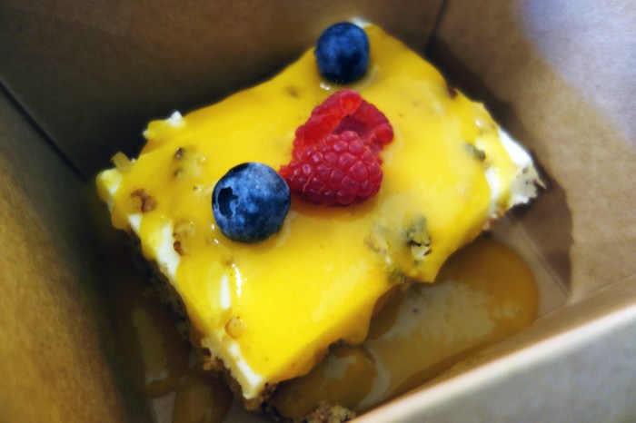 Dang Geun Keikeu is « carrot cake » in Korean and Bibibap’s version is pretty traditional. A moist block of carrot cake, which I suspect was prepared with some crushed walnuts added to the dough, is topped with a rather rigid and thick cream cheese frosting. A bright yellow coulis of yuzu (and peach?) is poured over the top, as well as some fresh blueberries and raspberries for garnish. As far as carrot cakes go, this one wasn’t bad at all. The frosting could have been slightly softer and frothier, but the flavor was just right. A good take on a classic.