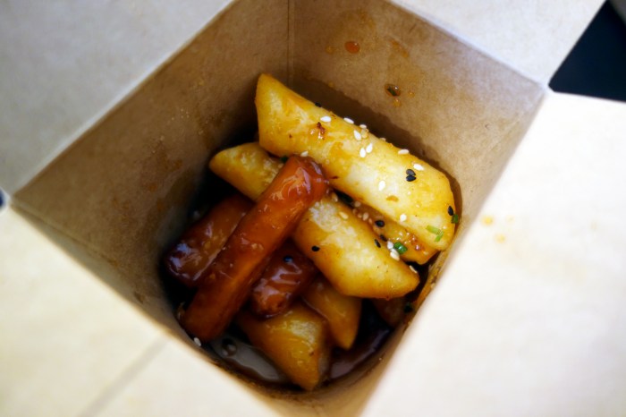Tteok Bokkeum is a funky little side dish that features chewy, log-shaped cakes of glutinous rice and fried sweet potato wedges doused in the sweet chili sauce that also appears on their fried chicken. I don’t think too many people order this one and I don’t think I would personally order it again, given the dense and starchy texture of the cakes and my general dislike of sweet potatoes. Next !