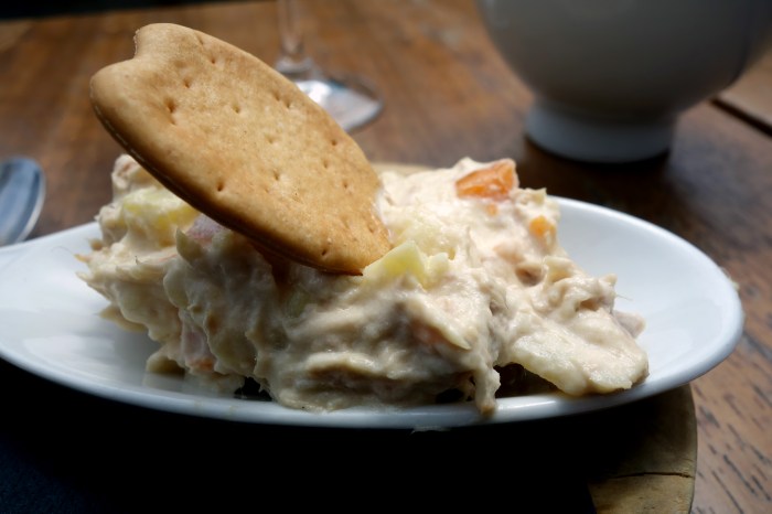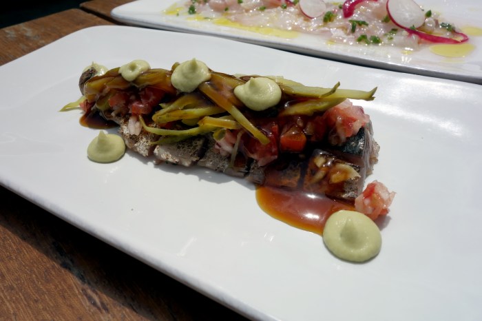 The wine arrived with a generous portion of house-made potato chips, bread and a little complimentary tapas of ensaladilla rusa. The latter was creamy but not overly sloppy with mayonnaise as this Spanish classic tends to be. Boiled potatoes, carrots and green peas were mixed up with flaky tuna to be scooped up with a crumbly cracker. The perfect little snack to whet our appetites.