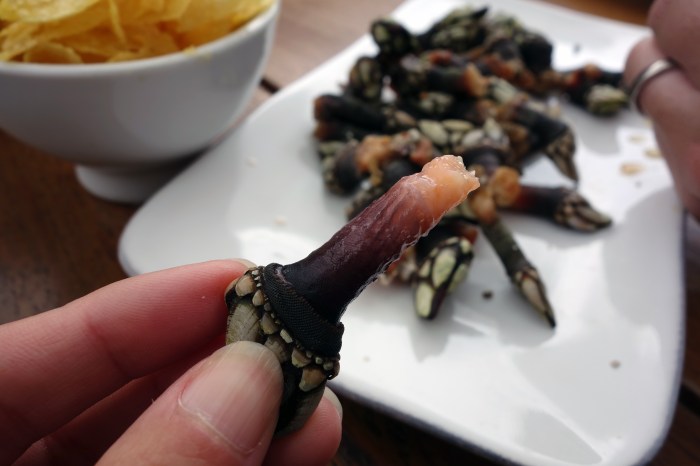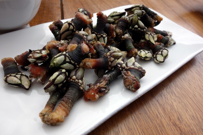 We ordered a portion and shamelessly admitted to our waiter that we have no idea how to eat them. He showed us how to pinch the diamond-shaped feet between thumb and forefinger and twist off the rough exterior coating to reveal the soft, pink tubes of flesh inside. These are edible all the way up to the creepy alien claw. The whole heap is usually boiled in salted water with a bay leaf, allowing the naturally sweet flavor of the animal to shine through. It tastes a bit like stone crab and has a delightfully tender consistency.
