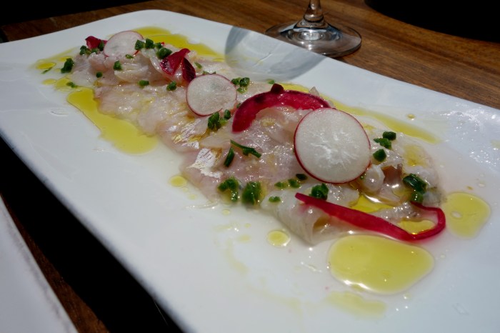 We knew as far as “un porción de percebes et unas navajas por favor” and let our guy guide us through the rest of the menu. He picked out for us three gorgeous dishes that really showcased the chef’s creativity and talent. The first of these was a lovely ceviche of sea bass, no doubt caught earlier that day. The slippery, smooth ribbons of fish were sliced super thin and presented with pickled red onions, some disks of zingy raw radish and spring onions, all doused in a very piquant and refreshing citrus oil. I will not soon forget the sensation of that fish melting on my tongue, while the lemony freshness of everything else woke up my palate and made my mouth water.