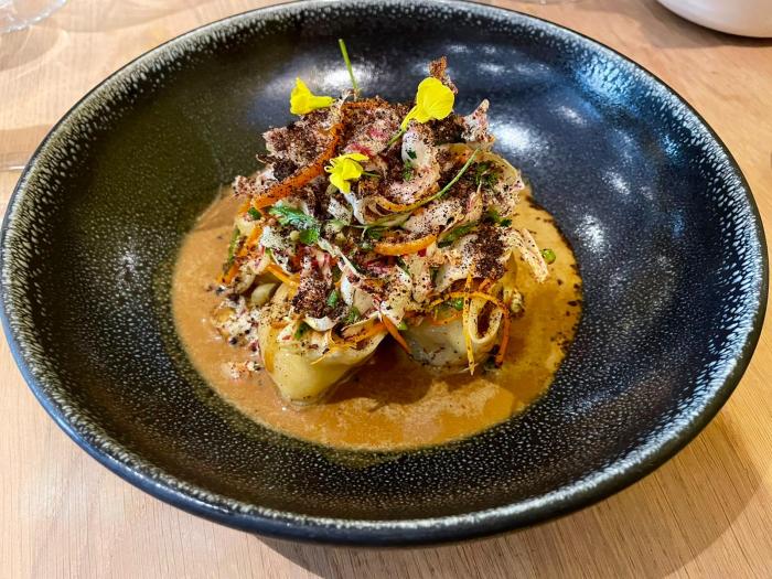 Grilled langoustine was used as stuffing in these dumplings, which were a tad on the tough side, but perfectly seasoned. A simple salad of shredded carrot and other root veg over the top and a very flavorful yet frothy and light langoustine bisque with a slightly smoky flavor at the base of the bowl.