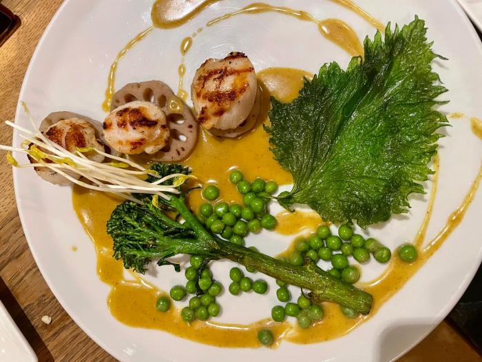 After gobbling up that chicken in 5 minutes flat, we couldn’t help ourselves from ordering more off La Lune’s fascinating menu. We tried their Saint Jacques (scallops), straight off the grill, super tender and boasting gorgeous caramelized lines left and right. These were served on fried rings of lotus root, with a branch of bright green broccolini, a paper-thin fried shiso leaf and some green peas sprinkled over the plate. There was also a wonderfully fragrant sauce made of shellfish broth and curry, which complemented the scallop meat nicely, imbuing the dish with tons of flavor.