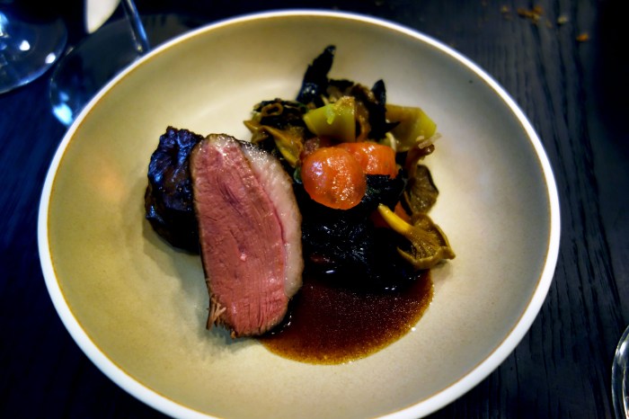 Ben’s magret d’oie was exceptional. The goose breast was served a warm red rare, with a healthy layer of silken fat which hydrated the meat as it cooked and imbued it with an unparalelled richness. It melted in the mouth, leaving behind a very pronounced gamey taste, a deliciously sensual and savory twang of iron-rich blood. The meat was served in a pool of its deeply flavored pan juices, a mix of tender black trumpet mushrooms and girolles, along with the last tomatoes of the season, lightly pickled.