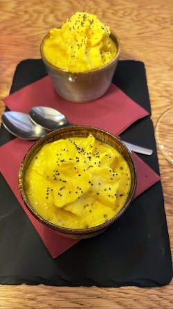 When the amused-bouche arrived, we understood the quality that we were in for. This was a lovely shot of warm pumpkin velouté, seasoned with turmeric and topped with house-made goat cheese chantilly, then sprinkled with poppy seeds.
