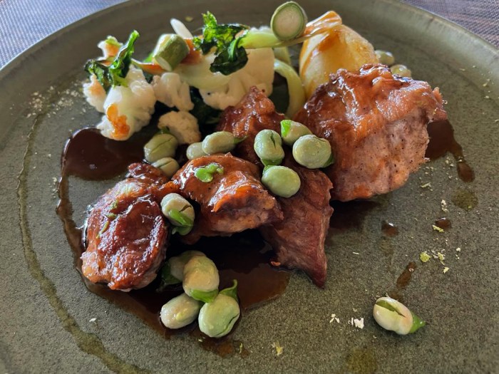 The next dish was exquisite, with a lovely texture I still daydream about on occasion. A golden-colored raviolo with a slick, slippery, very smooth dough wrapped loosely around a mouthwatering filling of roasted-then-shredded chicken, seasoned with wild mushrooms. This was topped with a generous dose of freshly shredded sheep’s milk cheese, fragrant shavings of black truffle, bright green snap peas (both in and out of their pod) and delicate microgreens. This already very juicy, moist dish was served in a delicious chicken broth, which provided an extra bit of hydration without messing with the wonderful texture of the raviolo skin. A beautiful display of early spring in Priorat, a joy to both look at and devour.