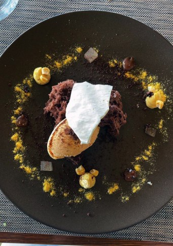 Dessert was a piece of modernist art titled “Expressions of Chocolate,” which actually brought together a bunch of interesting non-chocolate ingredients on a single plate. A dark chocolate cake with a mossy, spongy texture was served with a frosty quenelle of pumpkin ice cream, some crunchy bits of toasted corn, spicy Jamaican pepper dust and elastic bits of gelatin also flavored with chili peppers. I’m not usually a big fan of sweets, but this one hit the spot just right, perfect with a cup of bitter espresso and a last sip of Vichy Catalan.