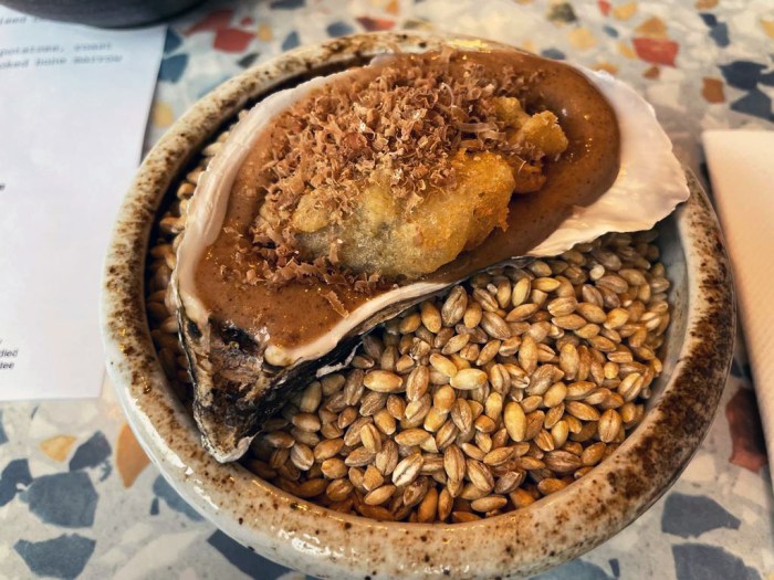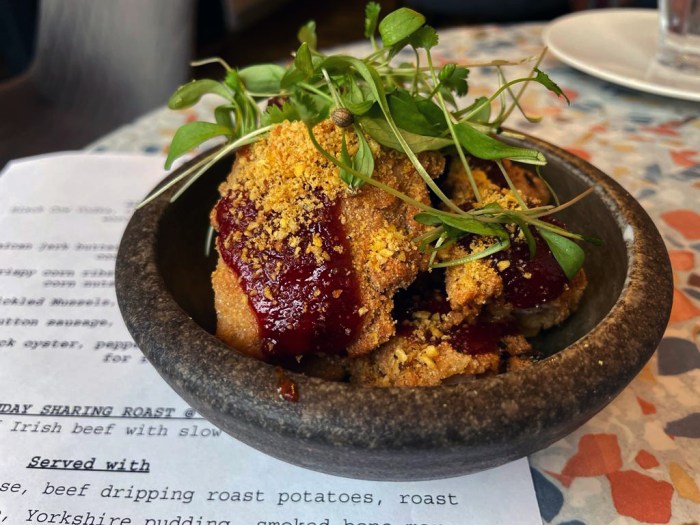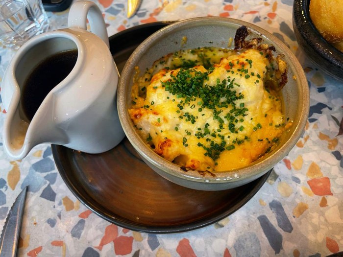 The star of the show was the savory, juicy 42-day-aged Irish beef sirloin, which was roasted to a perfect blush pink and served with a sprinkle of coarse salt that brought out its mellow umami. Next to that was a handsome wedge of smoky, char-grilled Hispi cabbage, drizzled in a tangy seasoned mayo, a chunk of sweet roasted onion doused in smoked bone marrow gravy and a golden pillow of Yorkshire pudding, crispy on the outside and eggy, kind of chewy on the inside. A generous bit of extra gravy was provided in a gravy boat on the side, which we poured all over everything, making especially sure to get the delicious liquid deep into the nooks and crannies of the pudding. It was smoky, nutty and packed with beautiful beef essence, a silky-smooth, fatty blanket of flavor.