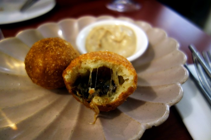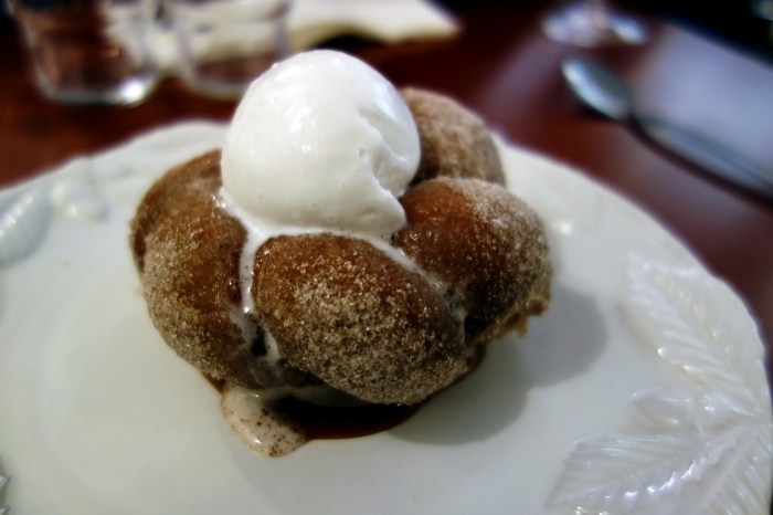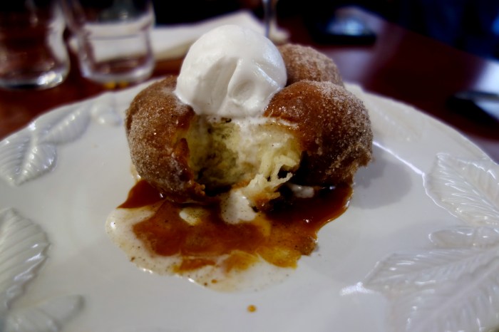 And for dessert? A Pinoy doughnut called bicho-bicho, coated in cinnamon sugar and served with an sticky-sweet caramel sauce and a scoop of coconut sorbet over the top. The bicho was slightly doughier and denser (even eggier?) than I expected but still quite light and still warm, causing the sweet coconut ice cream to melt over it beautifully. The cinnamon coat had a pleasant sandy texture and melted against the warm caramel at the base of the pastry, imbuing every bite with a cozy cinnamon flavor. We enjoyed this dessert with a glass of chilled Umeshu Niwa No Uguisu “Tomeri” plum wine made with Ume plums, which offered a fresh acidity and a very rich mouthfeel to complement this hearty, comfort food dessert.
