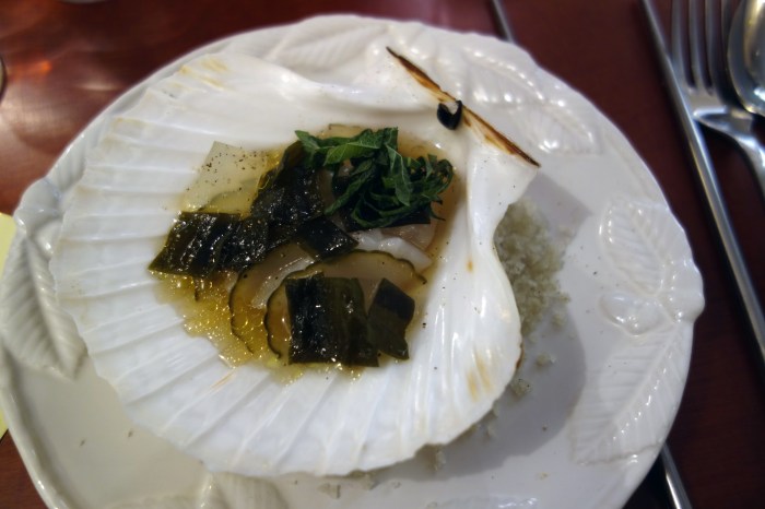 Like a delicate, bare Aphrodite, raw slices of scallop were served on the half shell, covered with paper-thin slices of seaweed that seemed to melt on, along with some pickled cucumbers, whose sweet touch reminded me of bread and butter pickles. The mix was seasoned with tosazu, a Japanese dressing made with vinegar, soy sauce, mirin and bonito dashi stock, which added an exquisite smoked fish umami to the dish.