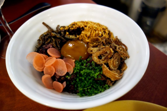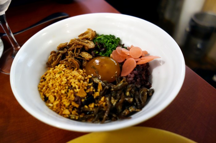 We ordered some red rice, which came topped with fried anchovies, fried garlic, fried shallots, fresh spring onions, pickled radish, and raw yolk. When mixed up, the gooey yolk bound all the other ingredients, making it easy to scoop up hearty mouthfuls. An excellent mix of different textures and flavors, from the crispy fried shallots to the earthy umami of the anchovies, the tang of the pickle and the sober heat of the garlic.