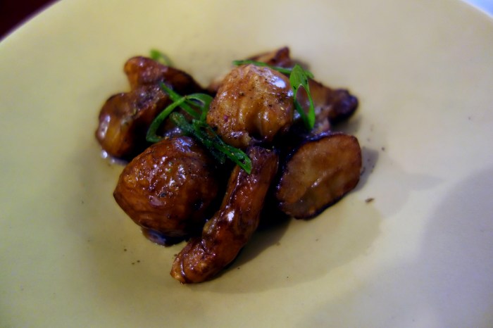 Lumpy little Jerusalem artichokes were roasted to perfection and dressed in a sticky sweet caramel sauce seasoned with 5-spice powder. The tubers had a texture similar to that of a roasted tomato, but a sweeter, nuttier, earthier flavor, which was complemented beautifully by the cinnamon, clove and pepper in the sauce.