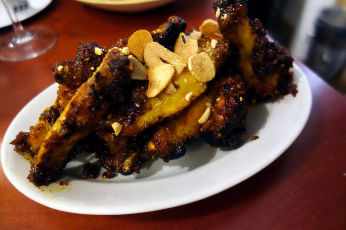 Double Dragon’s chicken wings are marinated in a Thai chili sauce called prik pao, then thrown on the barbecue and topped with a generous sprinkle of thinly sliced fried garlic and some crushed peanuts before serving. The sauce in which the meat is marinated and which also coats the wings is made with charred chilis, shallots, garlic, dried shrimp, fish sauce and tamarind paste, imbuing the chicken with a heavenly mix of sweet, salty, spicy and umami flavors. These flavors become even more intense as they are activated by the heat of the grill, which also adds its own smoky touch to the ensemble. The sauce caramelizes and thickens over the chicken into a flavor-packed paste to lick off one’s fingers. Garlic adds sweetness and a touch of bitter, while the peanuts bring a sweet, nutty touch.