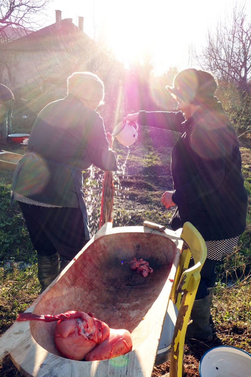 They wash off the exterior of the small intestines with cold water and continue soaking them in a wooden trough filled with ice cold water.