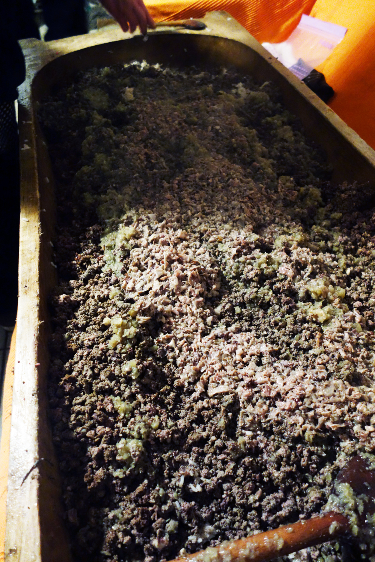73 Published January 5, 2015 at 1500 × 2250 A wooden trough is lain over a couch in the makeshift kitchen on the ground floor of the house. It is filled with rice and the ground innards are added over the top.